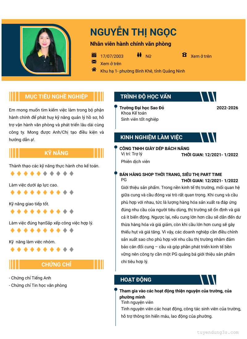 Mở xem thông tin đầy đủ ứng viên Nguyễn Thị Ngọc chỉ với 2 điểm. Ứng viên được cập nhật ngày 01/04/2026