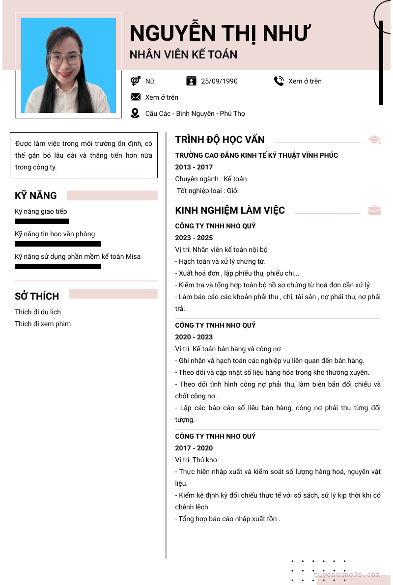 Mở xem thông tin đầy đủ ứng viên NGUYỄN THỊ NHƯ chỉ với 2 điểm. Ứng viên được cập nhật ngày 12/09/2025