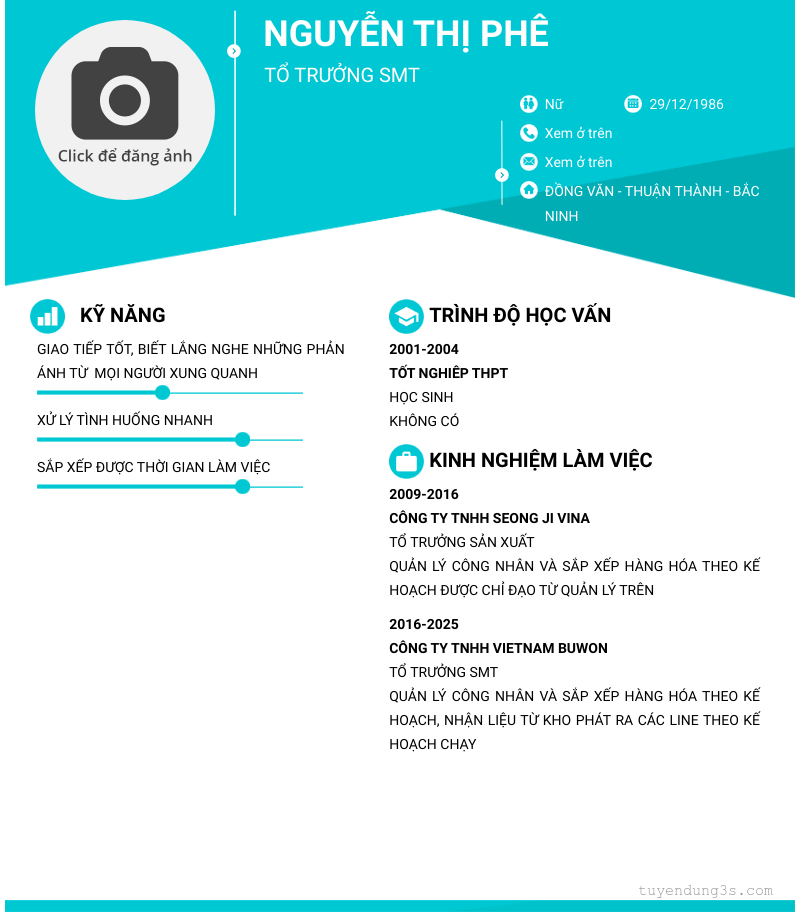 Mở xem thông tin đầy đủ ứng viên NGUYỄN THỊ PHÊ chỉ với 2 điểm. Ứng viên được cập nhật ngày 21/10/2025
