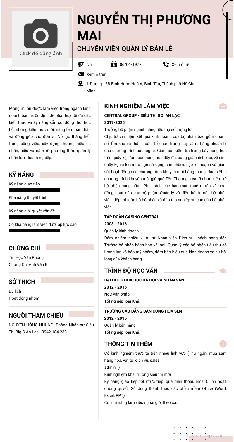 Mở xem thông tin đầy đủ ứng viên NGUYỄN THỊ PHƯƠNG MAI chỉ với 2 điểm. Ứng viên được cập nhật ngày 02/12/2025