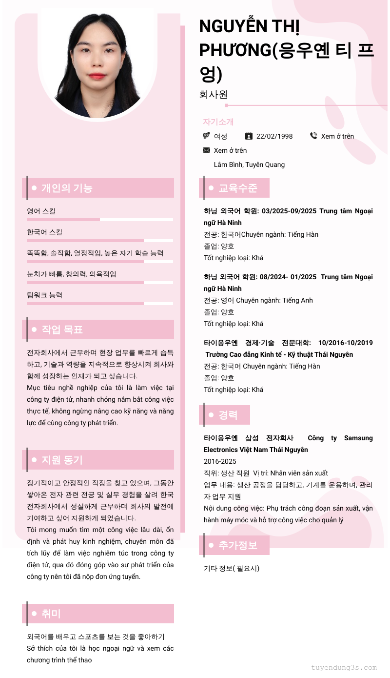 Mở xem thông tin đầy đủ ứng viên Nguyễn Thị Phương(응우옌 티 프엉) chỉ với 2 điểm. Ứng viên được cập nhật ngày 20/12/2025