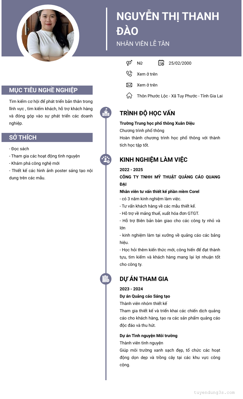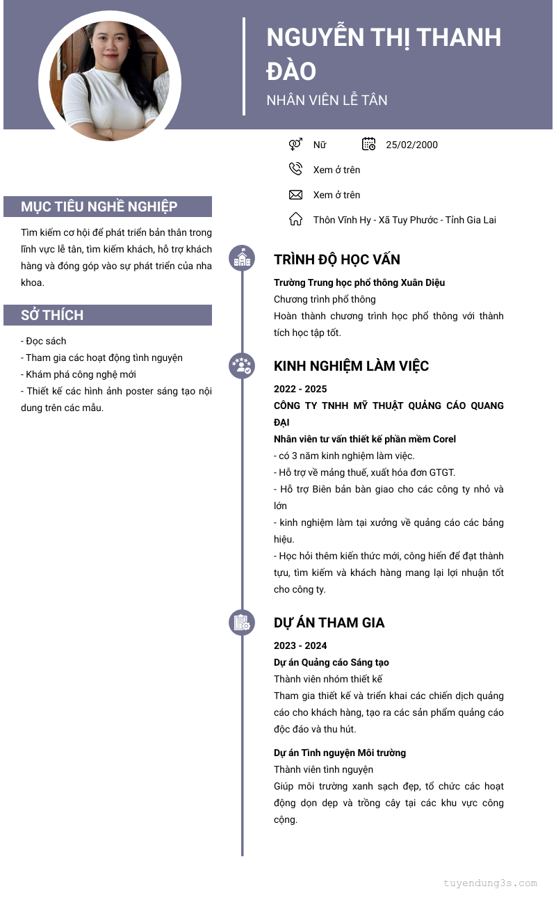 Mở xem thông tin đầy đủ ứng viên Nguyễn Thị Thanh đào chỉ với 2 điểm. Ứng viên được cập nhật ngày 04/08/2025