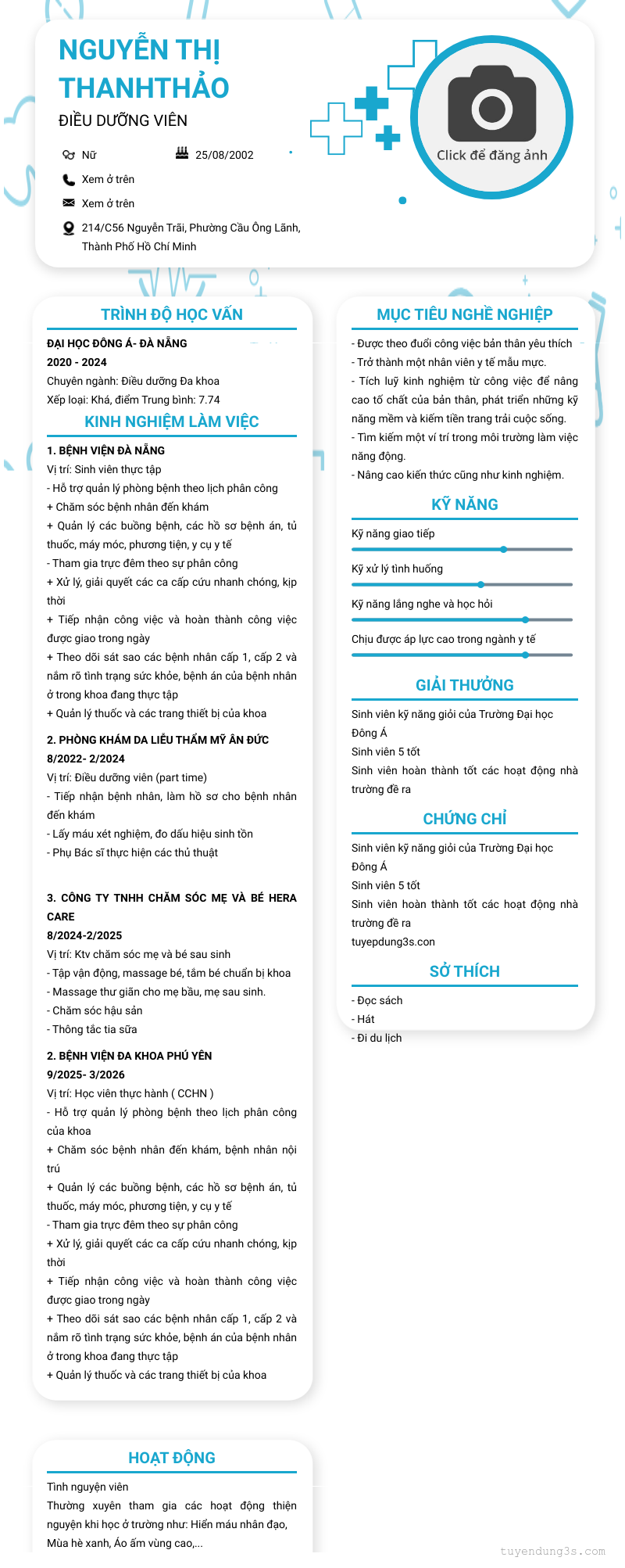 Mở xem thông tin đầy đủ ứng viên NGUYỄN THỊ THANHTHẢO chỉ với 2 điểm. Ứng viên được cập nhật ngày 03/04/2026