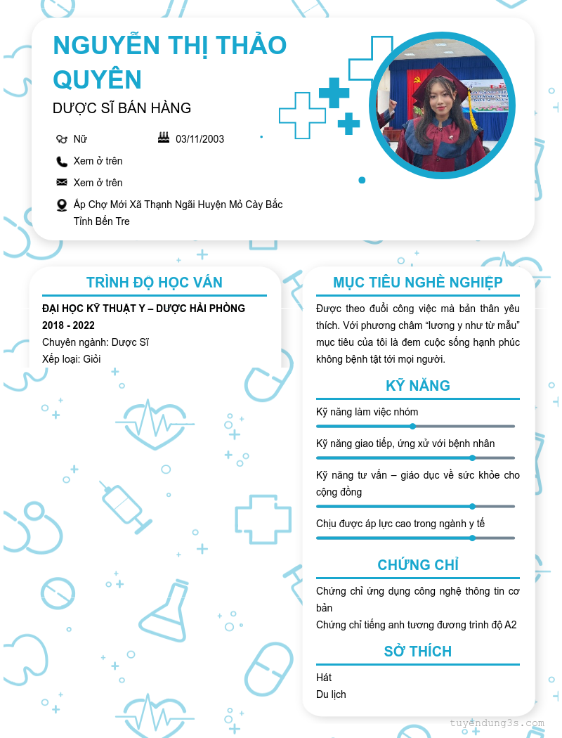 Mở xem thông tin đầy đủ ứng viên Nguyễn Thị THẢO Quyên chỉ với 2 điểm. Ứng viên được cập nhật ngày 12/10/2025