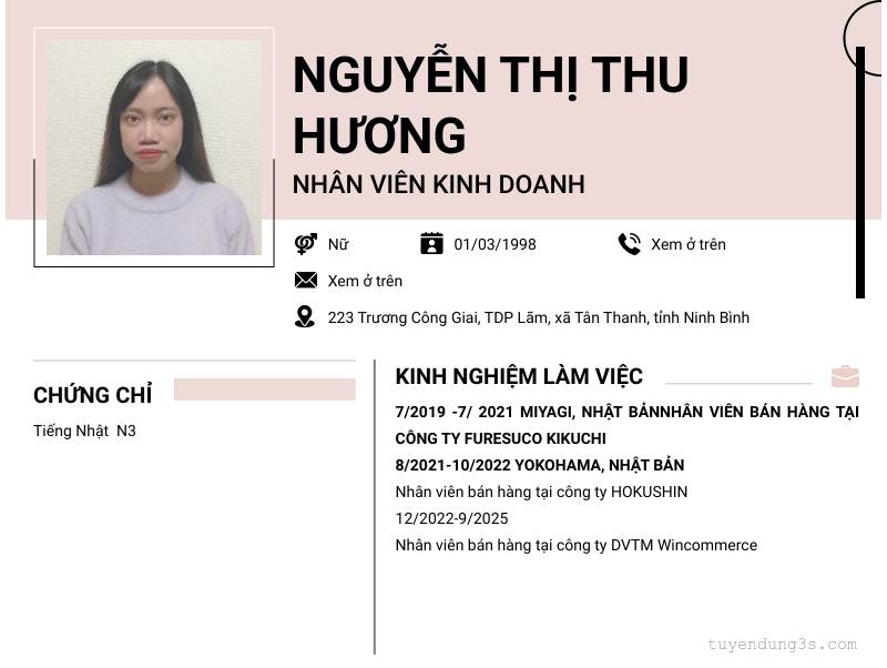 Mở xem thông tin đầy đủ ứng viên NGUYỄN Thị Thu Hương chỉ với 2 điểm. Ứng viên được cập nhật ngày 10/11/2025