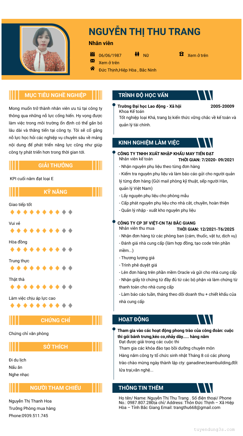 Mở xem thông tin đầy đủ ứng viên Nguyễn Thị Thu Trang chỉ với 2 điểm. Ứng viên được cập nhật ngày 11/03/2026
