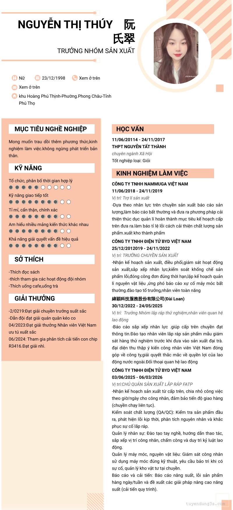 Mở xem thông tin đầy đủ ứng viên NGUYỄN THỊ THÚY 阮氏翠 chỉ với 2 điểm. Ứng viên được cập nhật ngày 07/03/2026