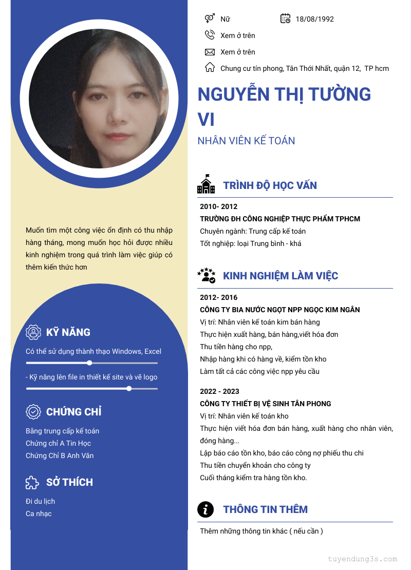 Mở xem thông tin đầy đủ ứng viên Nguyễn Thị Tường Vi chỉ với 2 điểm. Ứng viên được cập nhật ngày 22/02/2024