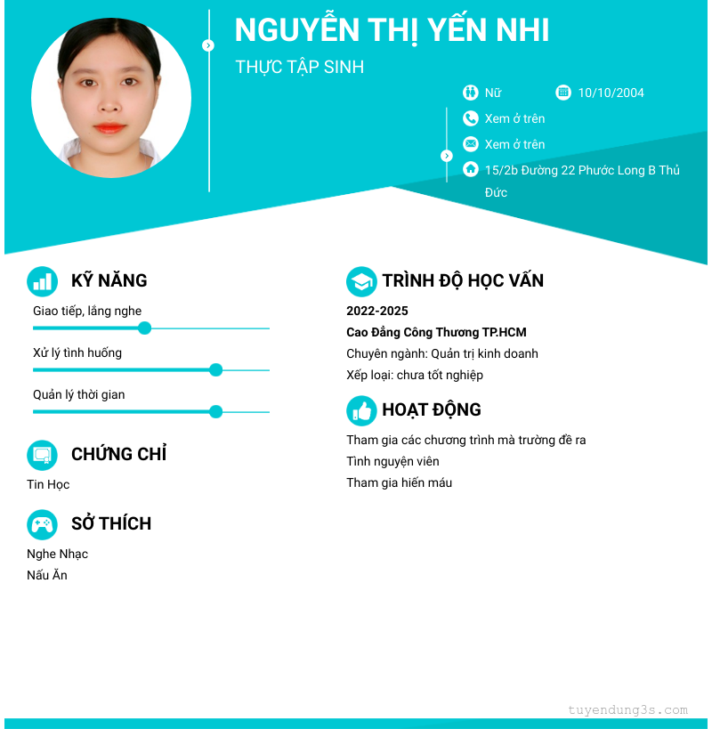 Mở xem thông tin đầy đủ ứng viên Nguyễn Thị Yến Nhi chỉ với 2 điểm. Ứng viên được cập nhật ngày 12/11/2025