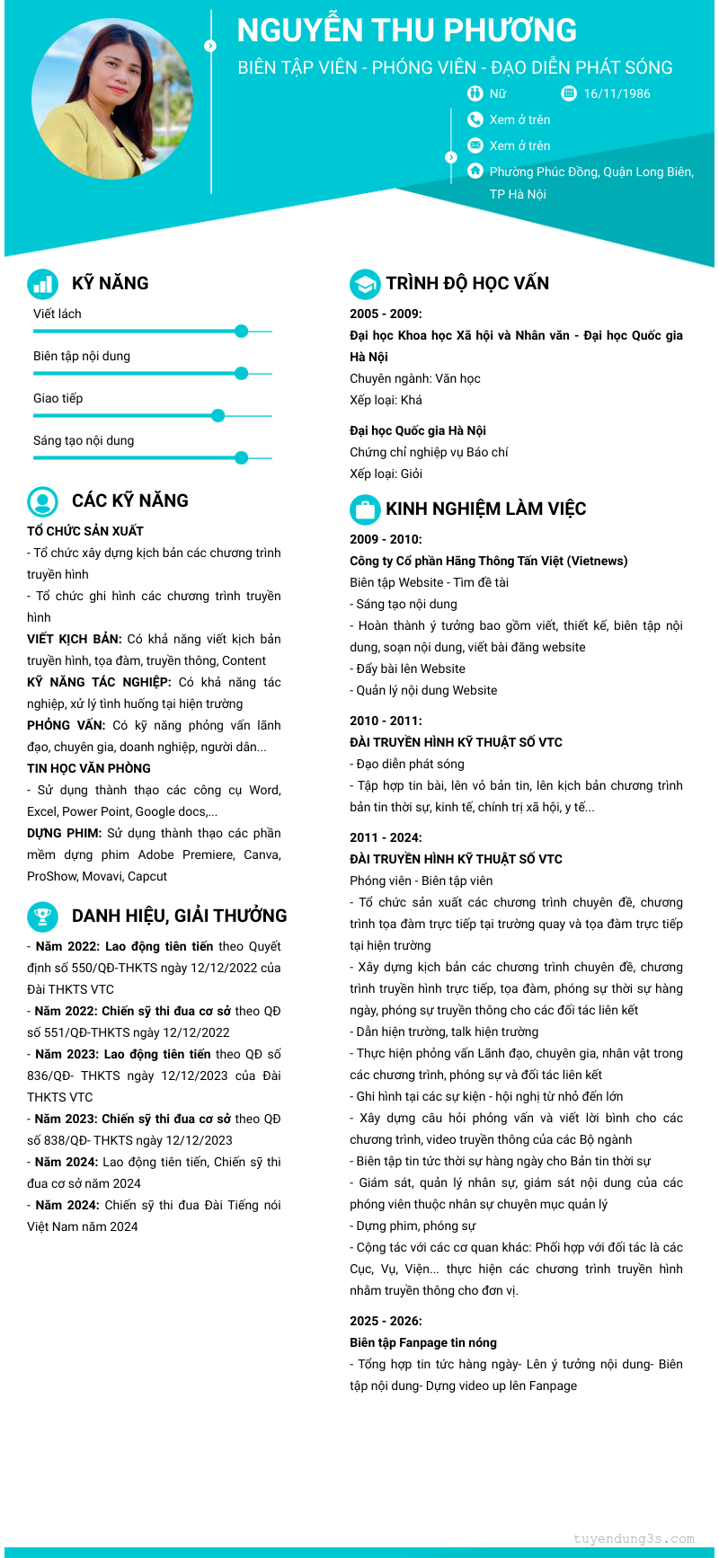 Mở xem thông tin đầy đủ ứng viên Nguyễn Thu Phương chỉ với 2 điểm. Ứng viên được cập nhật ngày 20/03/2026