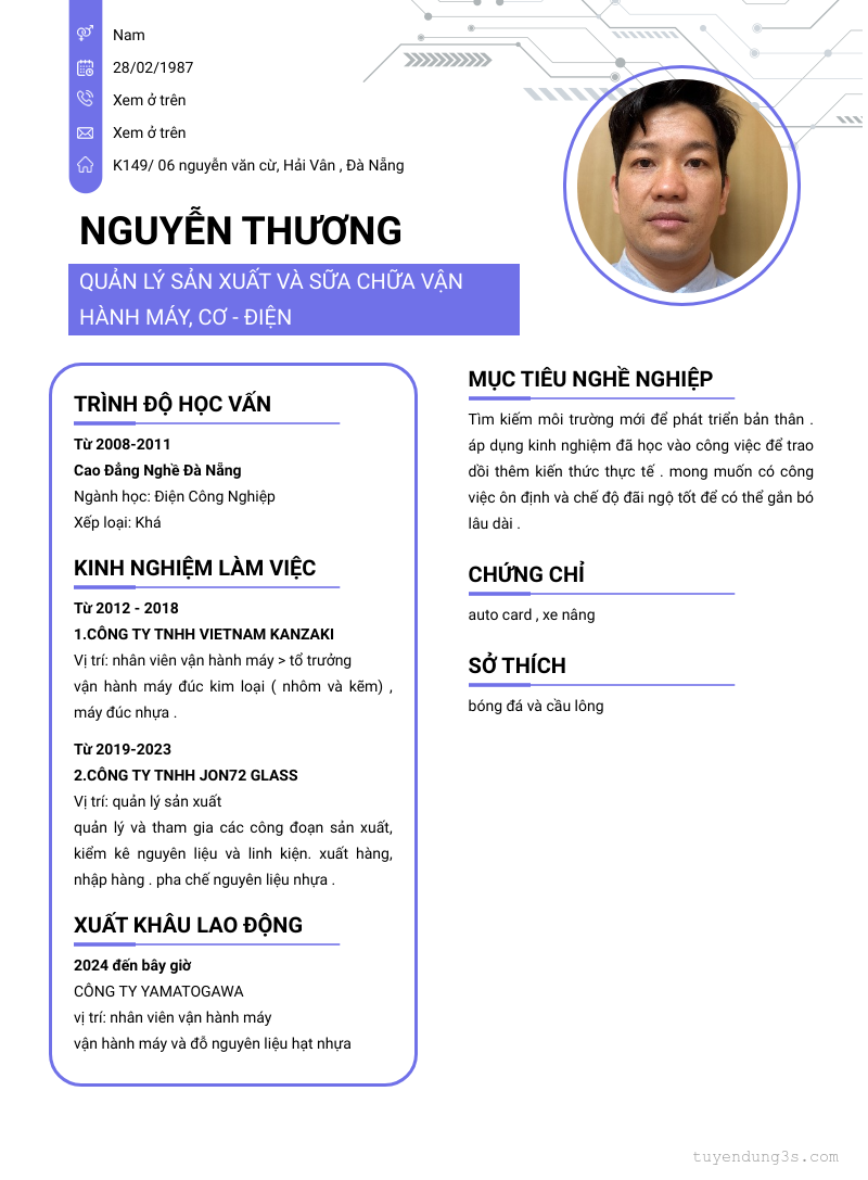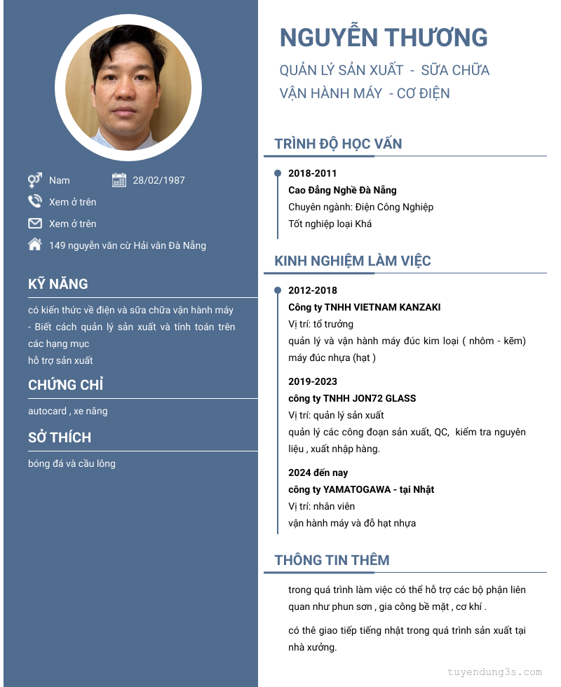 Vị trí: quản lý sản xuất - sữa chữa vận hành máy - cơ điện
