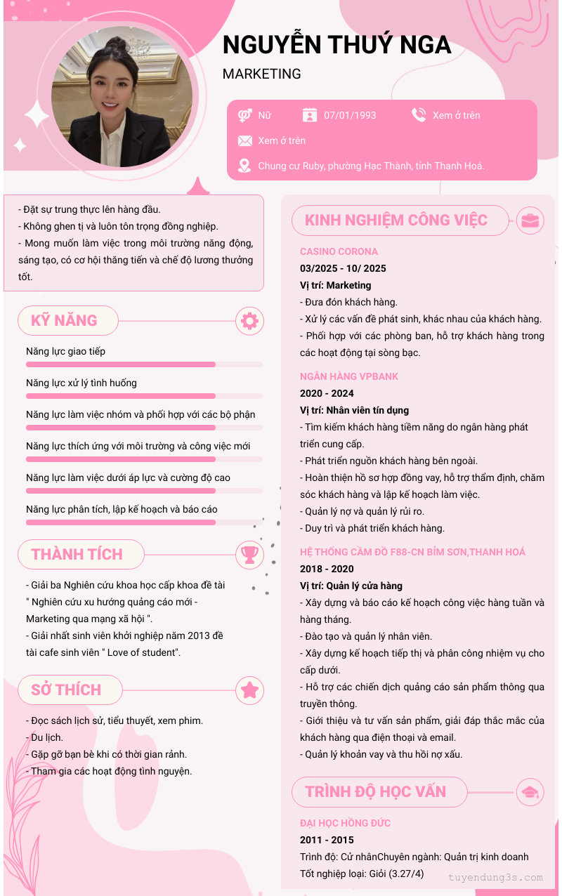 Mở xem thông tin đầy đủ ứng viên Nguyễn Thuý Nga chỉ với 2 điểm. Ứng viên được cập nhật ngày 31/03/2026