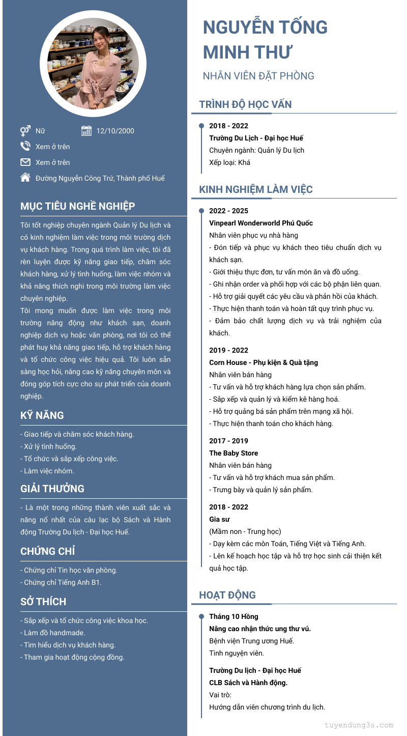 Mở xem thông tin đầy đủ ứng viên Nguyễn Tống Minh Thư chỉ với 2 điểm. Ứng viên được cập nhật ngày 10/03/2026