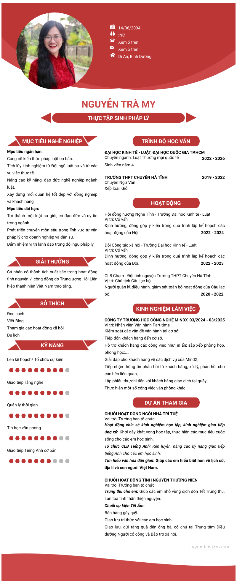 Mở xem thông tin đầy đủ ứng viên NGUYỄN TRÀ MY chỉ với 2 điểm. Ứng viên được cập nhật ngày 08/09/2025