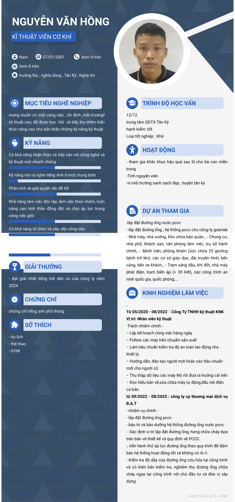 Mở xem thông tin đầy đủ ứng viên Nguyễn Văn Hồng chỉ với 2 điểm. Ứng viên được cập nhật ngày 14/10/2025