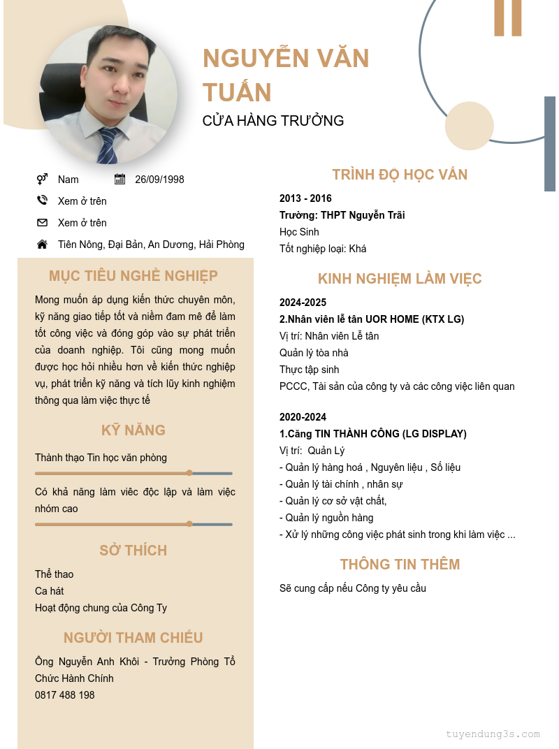 Mở xem thông tin đầy đủ ứng viên NGUYỄN VĂN TUẤN chỉ với 2 điểm. Ứng viên được cập nhật ngày 31/03/2026