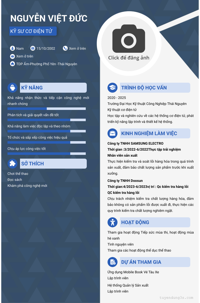 Mở xem thông tin đầy đủ ứng viên Nguyễn Việt đức chỉ với 2 điểm. Ứng viên được cập nhật ngày 19/03/2026