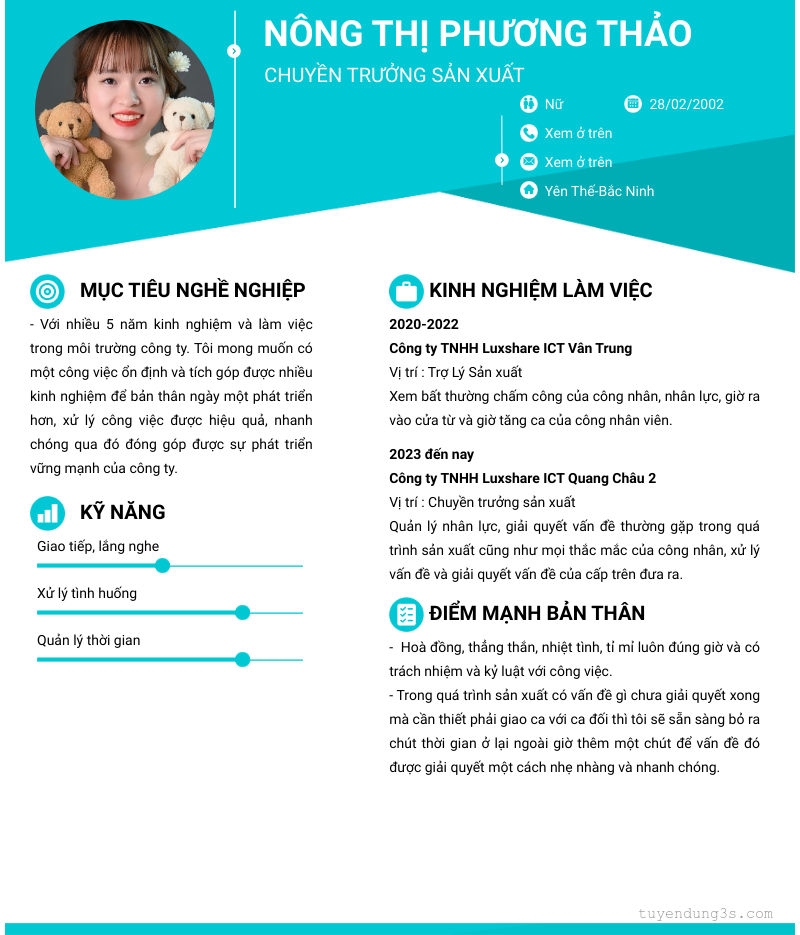 Mở xem thông tin đầy đủ ứng viên Nông Thị Phương Thảo chỉ với 2 điểm. Ứng viên được cập nhật ngày 09/10/2025