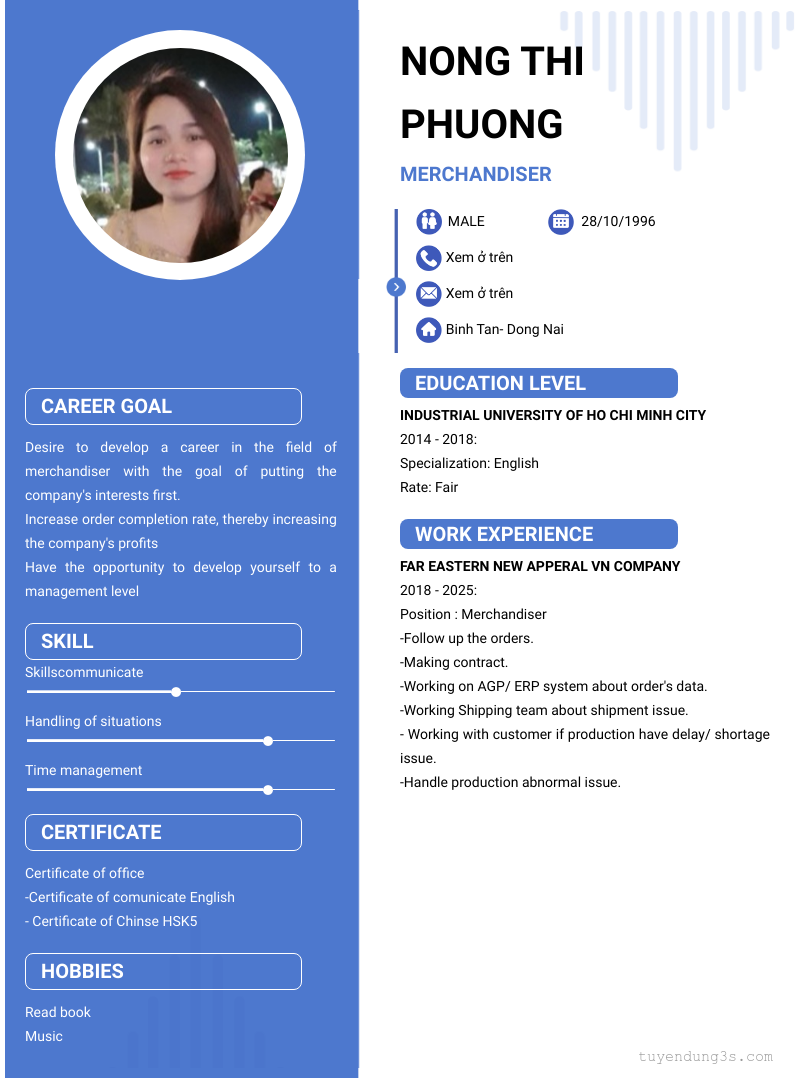 Mở xem thông tin đầy đủ ứng viên Nong Thi Phuong chỉ với 2 điểm. Ứng viên được cập nhật ngày 08/12/2025