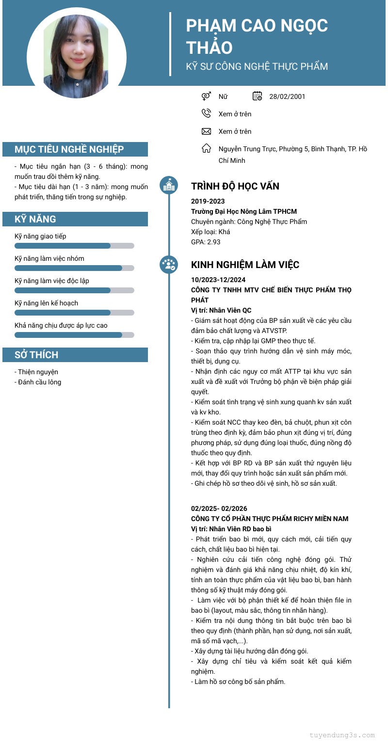 Mở xem thông tin đầy đủ ứng viên Phạm Cao Ngọc Thảo chỉ với 2 điểm. Ứng viên được cập nhật ngày 16/01/2026