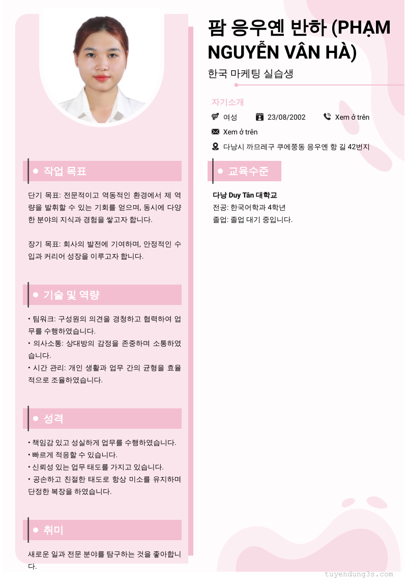Mở xem thông tin đầy đủ ứng viên 팜 응우옌 반하 (Phạm Nguyễn Vân Hà) chỉ với 2 điểm. Ứng viên được cập nhật ngày 06/11/2025