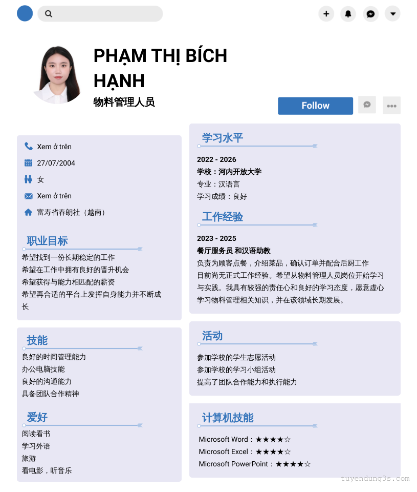 Mở xem thông tin đầy đủ ứng viên PHẠM Thị Bích Hạnh chỉ với 2 điểm. Ứng viên được cập nhật ngày 21/01/2026