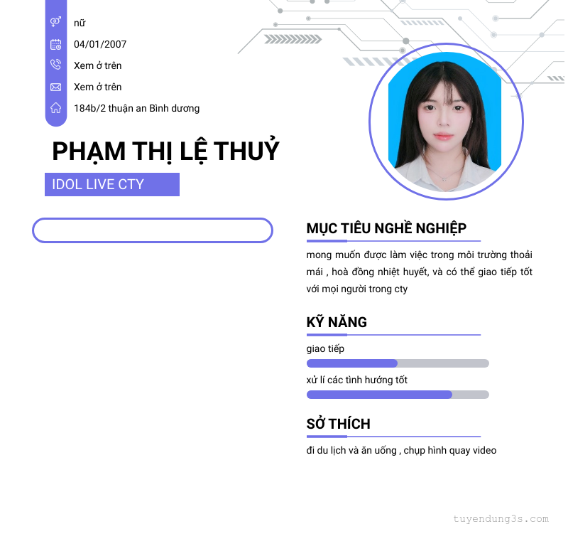Mở xem thông tin đầy đủ ứng viên Phạm Thị Lệ Thuỷ chỉ với 2 điểm. Ứng viên được cập nhật ngày 20/01/2026