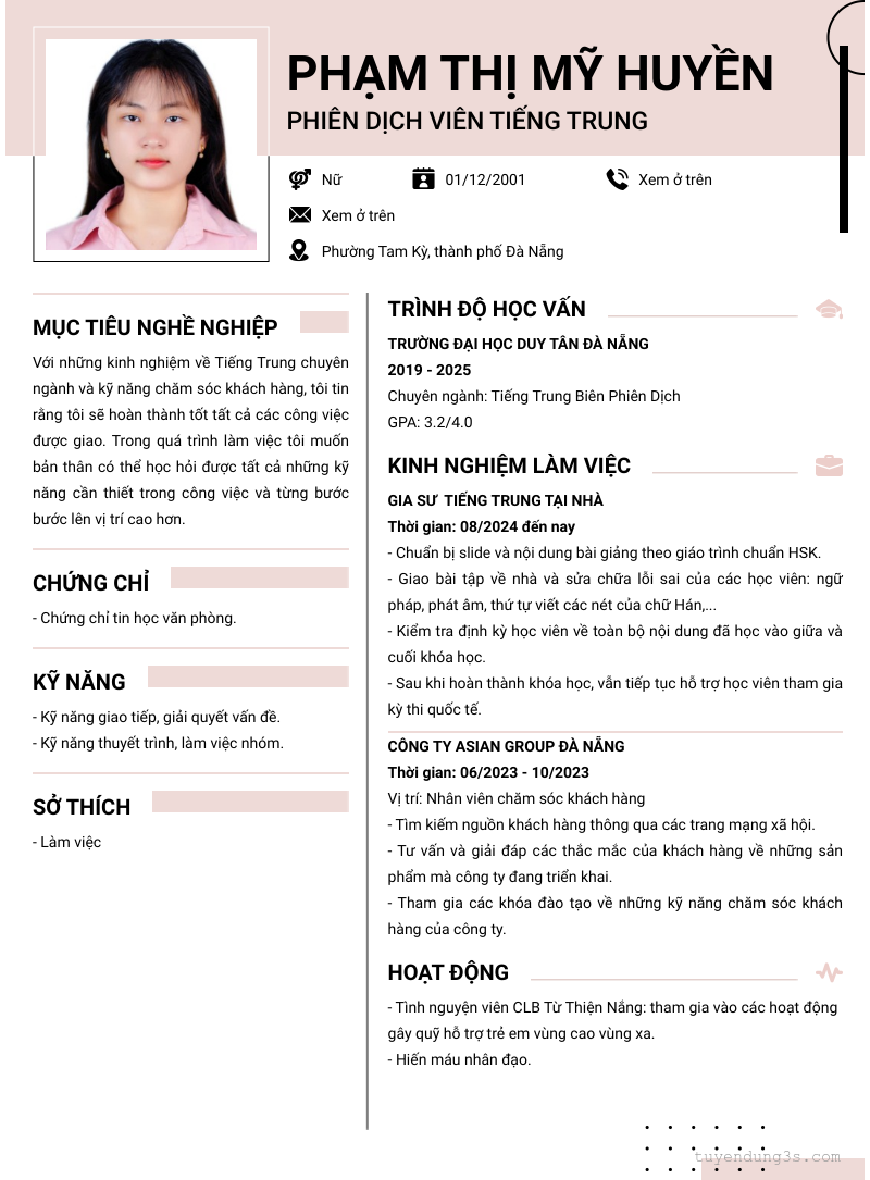 Mở xem thông tin đầy đủ ứng viên PHẠM THỊ MỸ HUYỀN chỉ với 2 điểm. Ứng viên được cập nhật ngày 20/08/2025