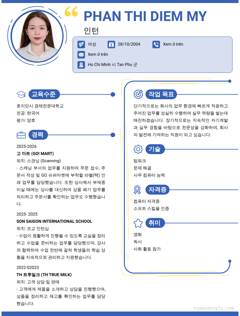 Mở xem thông tin đầy đủ ứng viên PhAN THI DIEM MY chỉ với 2 điểm. Ứng viên được cập nhật ngày 08/03/2026