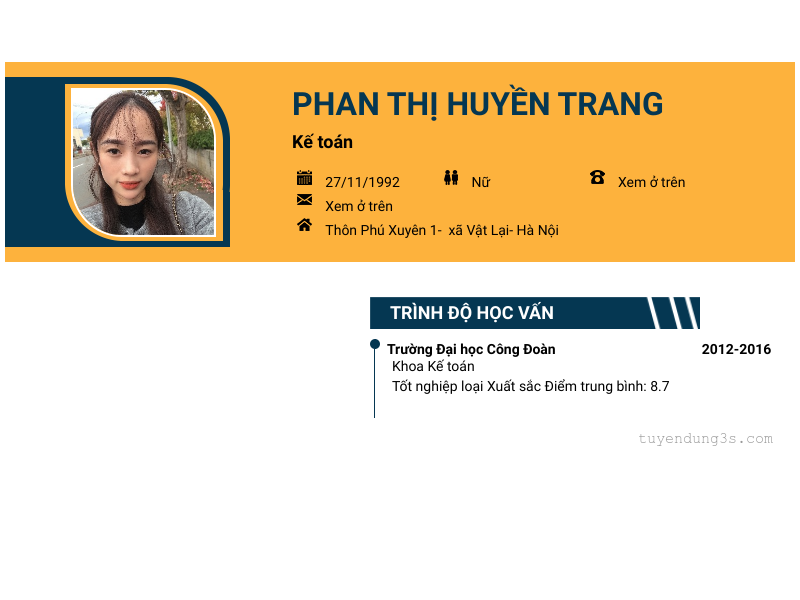 Mở xem thông tin đầy đủ ứng viên Phan Thị Huyền Trang chỉ với 2 điểm. Ứng viên được cập nhật ngày 14/01/2026