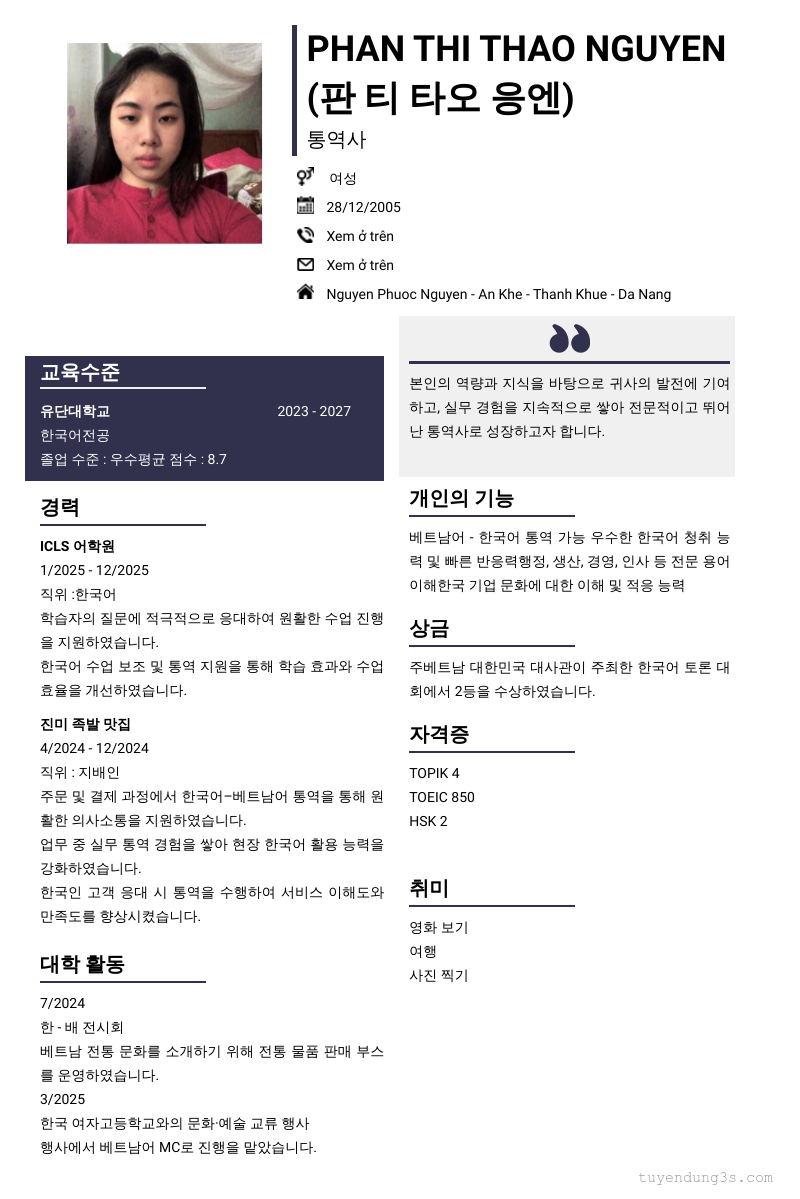 Mở xem thông tin đầy đủ ứng viên Phan Thi Thao Nguyen (판 티 타오 응엔) chỉ với 2 điểm. Ứng viên được cập nhật ngày 13/01/2026