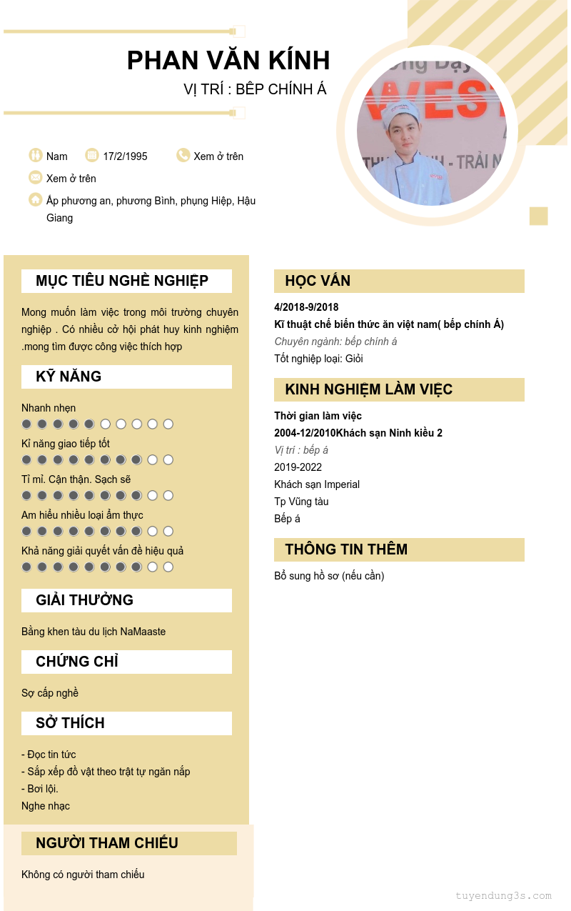 Mở xem thông tin đầy đủ ứng viên PhAN VĂn Kính chỉ với 2 điểm. Ứng viên được cập nhật ngày 08/01/2024
