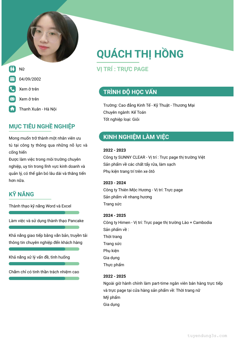 Mở xem thông tin đầy đủ ứng viên QUÁCH THỊ HỒNG chỉ với 2 điểm. Ứng viên được cập nhật ngày 27/09/2025
