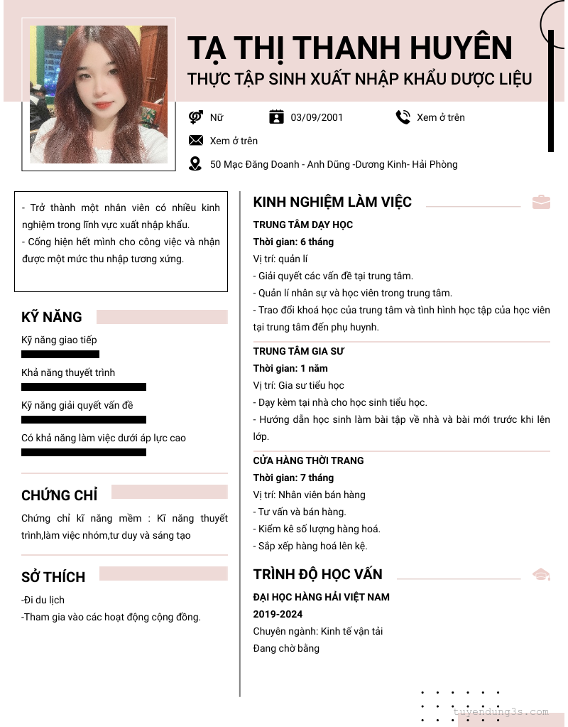 Nơi ở hiện tại: 50 Mạc Đăng Doanh - Anh Dũng -Dương Kinh- Hải Phòng