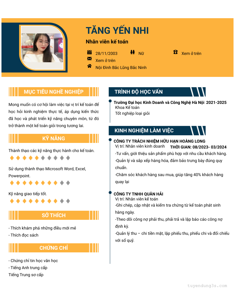 Mở xem thông tin đầy đủ ứng viên Tăng Yến Nhi chỉ với 2 điểm. Ứng viên được cập nhật ngày 02/10/2025