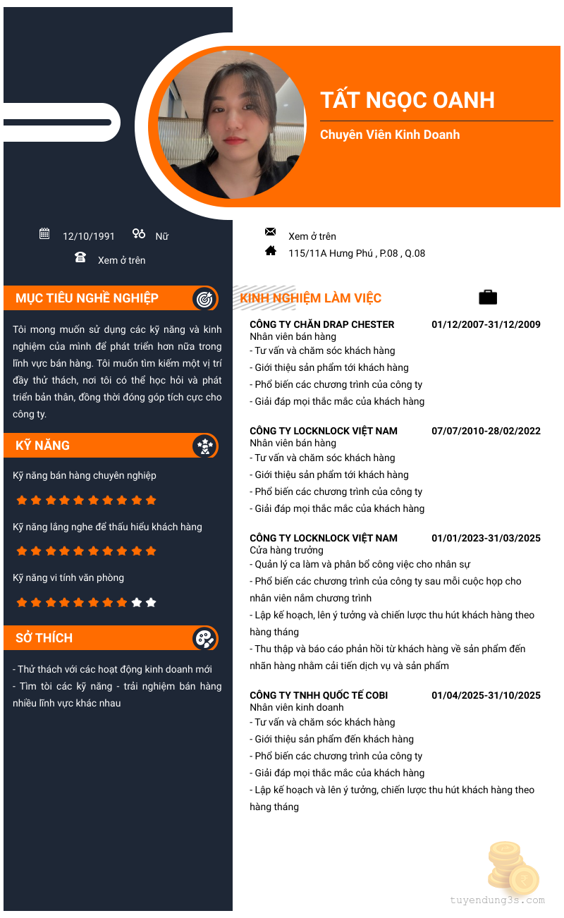 Mở xem thông tin đầy đủ ứng viên TẤT NGỌC OANH chỉ với 2 điểm. Ứng viên được cập nhật ngày 23/01/2026