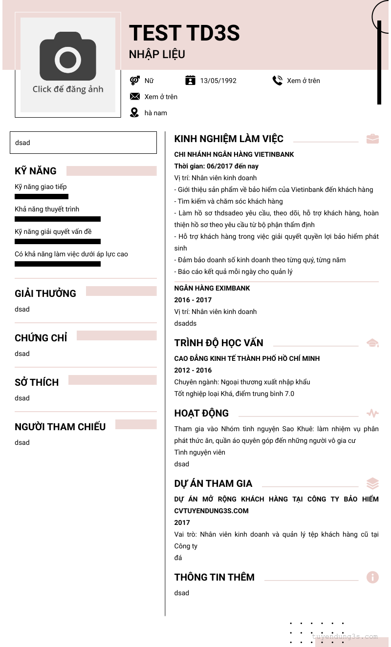 Mở xem thông tin đầy đủ ứng viên Test Td3s chỉ với 2 điểm. Ứng viên được cập nhật ngày 02/10/2025