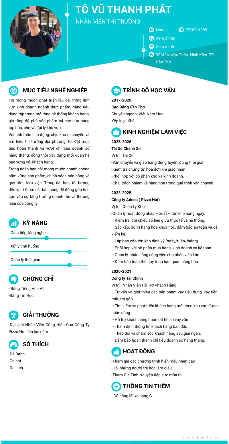 Mở xem thông tin đầy đủ ứng viên Tô Vũ Thanh Phát chỉ với 2 điểm. Ứng viên được cập nhật ngày 23/02/2026
