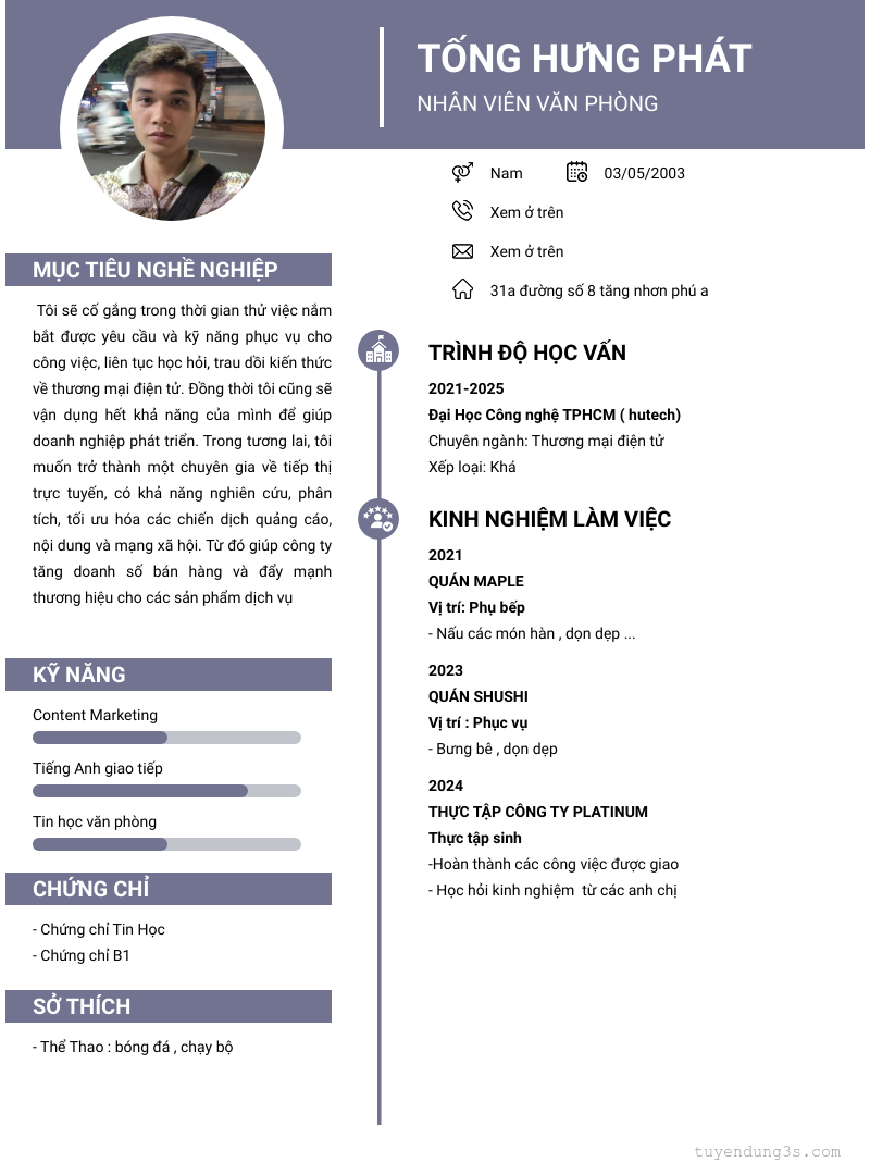 Mở xem thông tin đầy đủ ứng viên Tống Hưng Phát chỉ với 2 điểm. Ứng viên được cập nhật ngày 27/06/2024