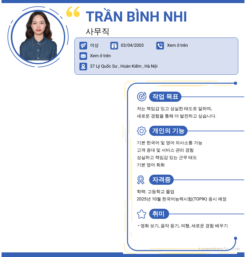 Mở xem thông tin đầy đủ ứng viên Trần Bình Nhi chỉ với 2 điểm. Ứng viên được cập nhật ngày 15/10/2025