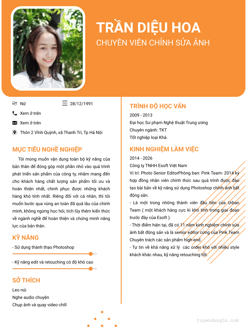 Mở xem thông tin đầy đủ ứng viên Trần Diệu Hoa chỉ với 2 điểm. Ứng viên được cập nhật ngày 14/02/2026