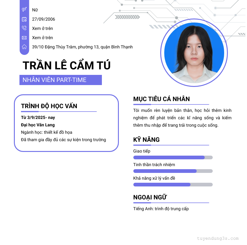 Mở xem thông tin đầy đủ ứng viên Trần Lê Cẩm Tú chỉ với 2 điểm. Ứng viên được cập nhật ngày 14/10/2025
