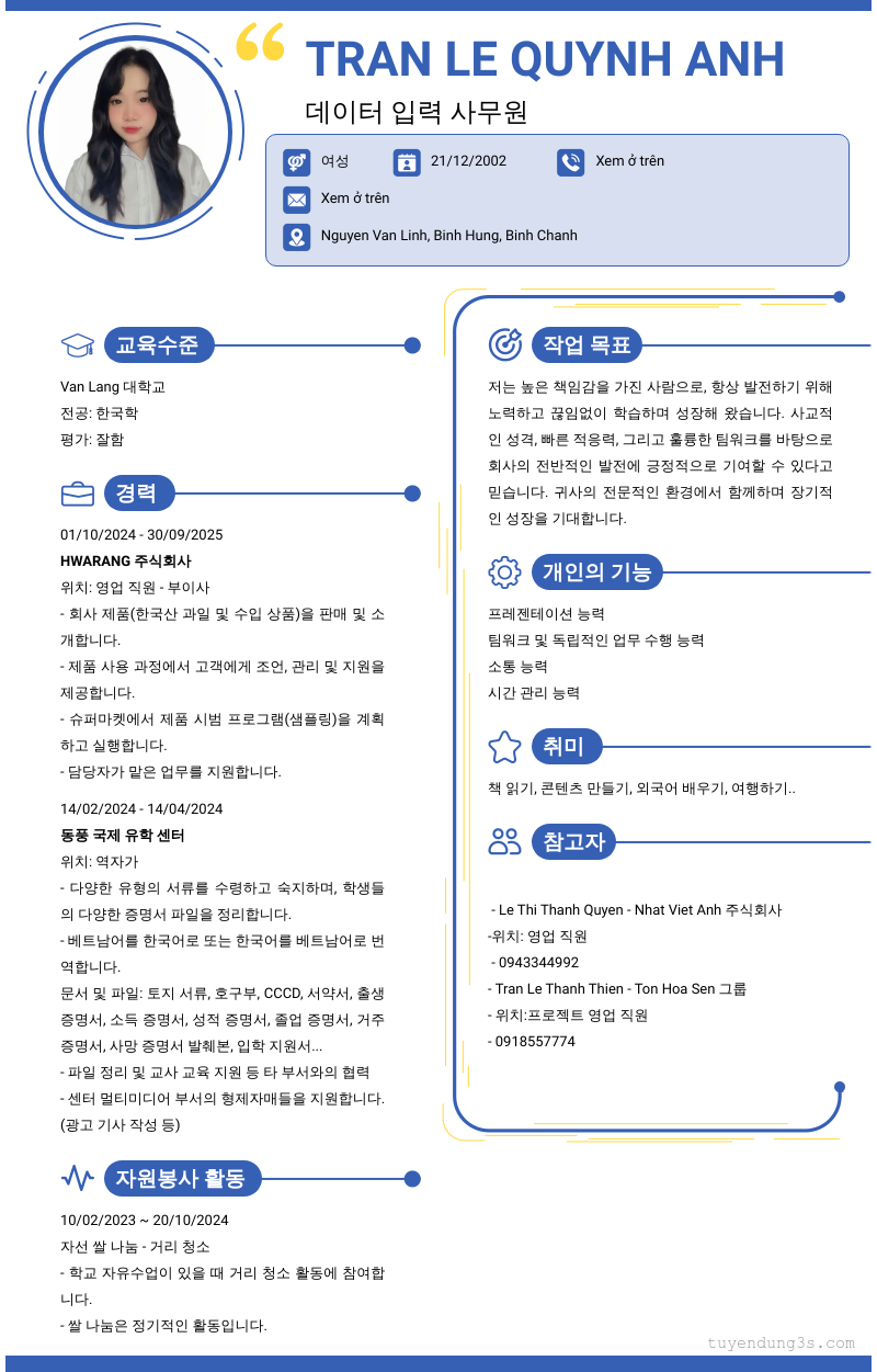 Mở xem thông tin đầy đủ ứng viên Tran Le Quynh Anh chỉ với 2 điểm. Ứng viên được cập nhật ngày 13/11/2025