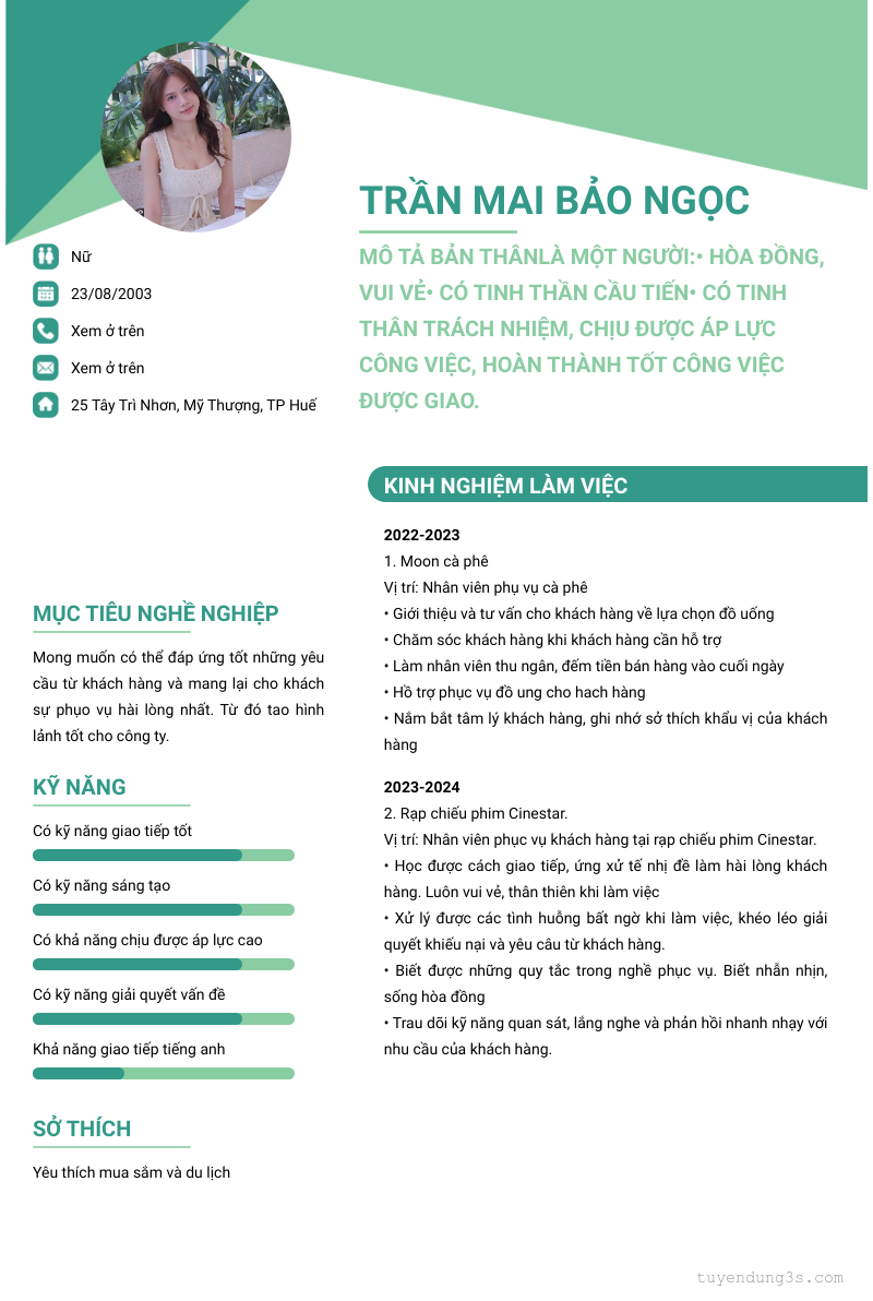 Mở xem thông tin đầy đủ ứng viên Trần Mai Bảo Ngọc chỉ với 2 điểm. Ứng viên được cập nhật ngày 19/10/2025