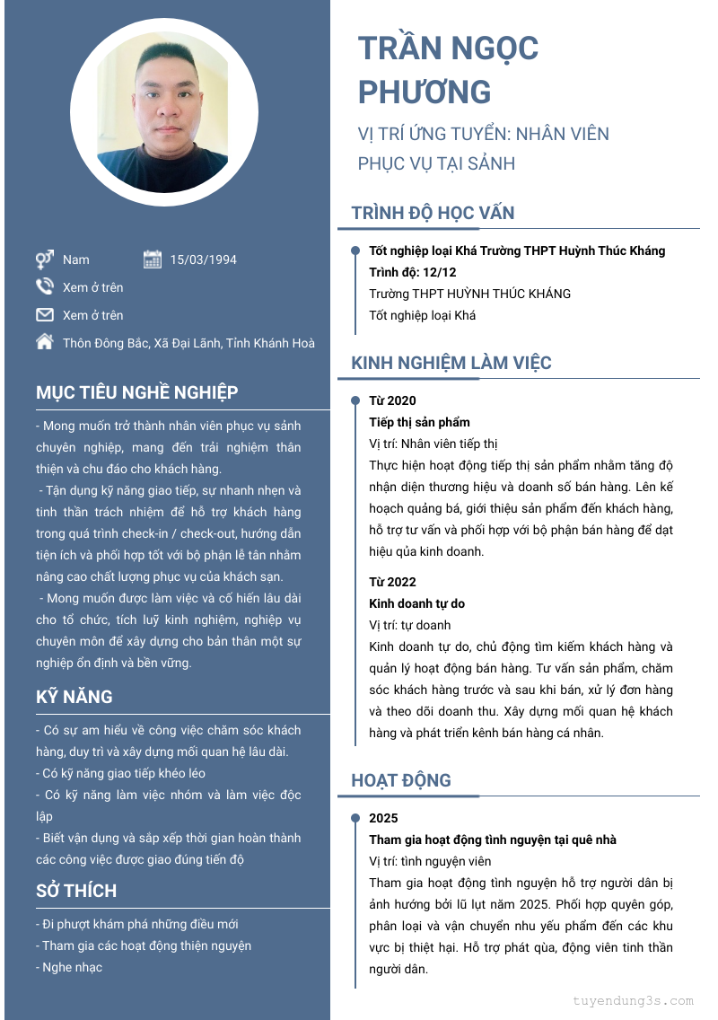 Mở xem thông tin đầy đủ ứng viên Trần Ngọc Phương chỉ với 2 điểm. Ứng viên được cập nhật ngày 03/04/2026