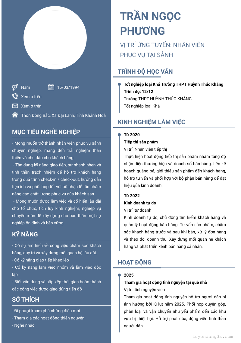 Mở xem thông tin đầy đủ ứng viên Trần Ngọc Phương chỉ với 2 điểm. Ứng viên được cập nhật ngày 03/04/2026