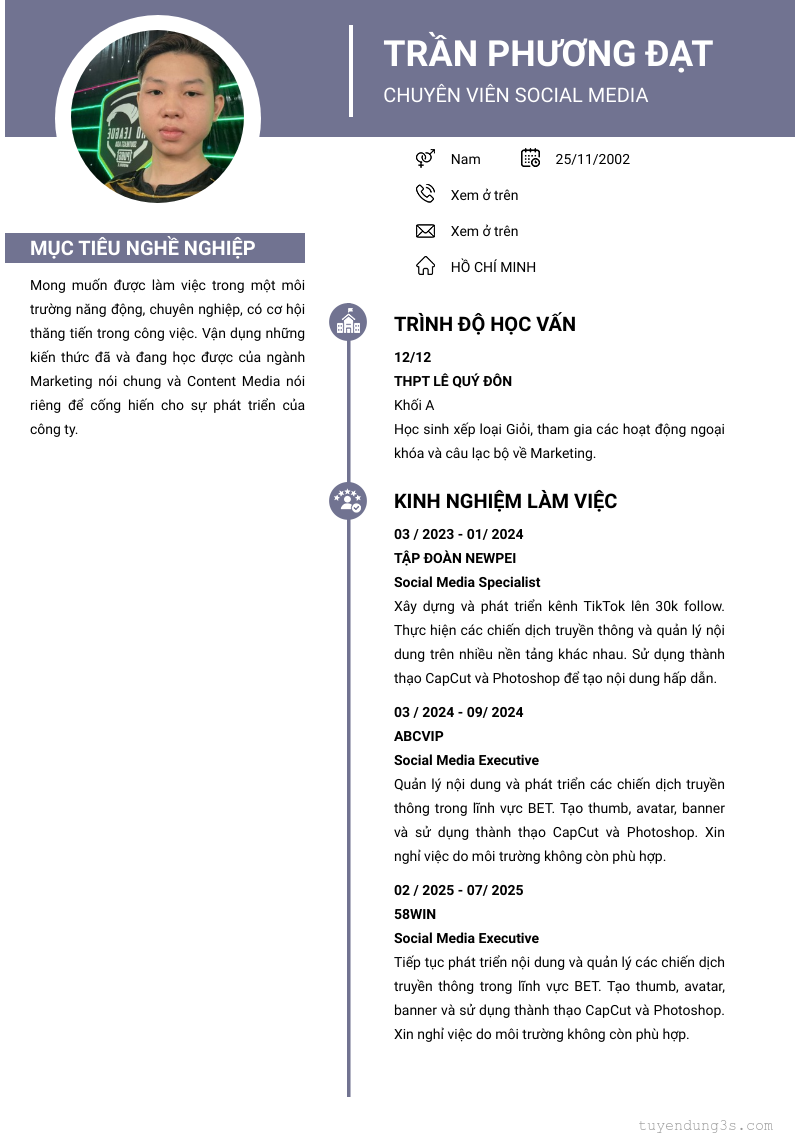 Mở xem thông tin đầy đủ ứng viên TRẦN PHƯƠNG ĐẠT chỉ với 2 điểm. Ứng viên được cập nhật ngày 24/09/2025