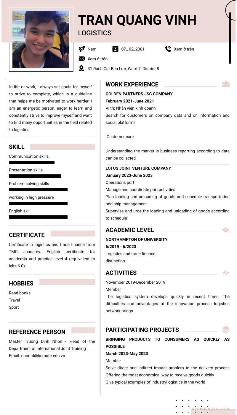 Mở xem thông tin đầy đủ ứng viên Tran Quang Vinh chỉ với 2 điểm. Ứng viên được cập nhật ngày 16/03/2024