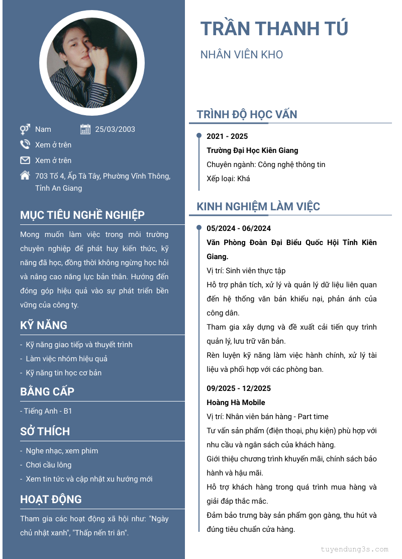 Mở xem thông tin đầy đủ ứng viên Trần Thanh Tú chỉ với 2 điểm. Ứng viên được cập nhật ngày 07/03/2026