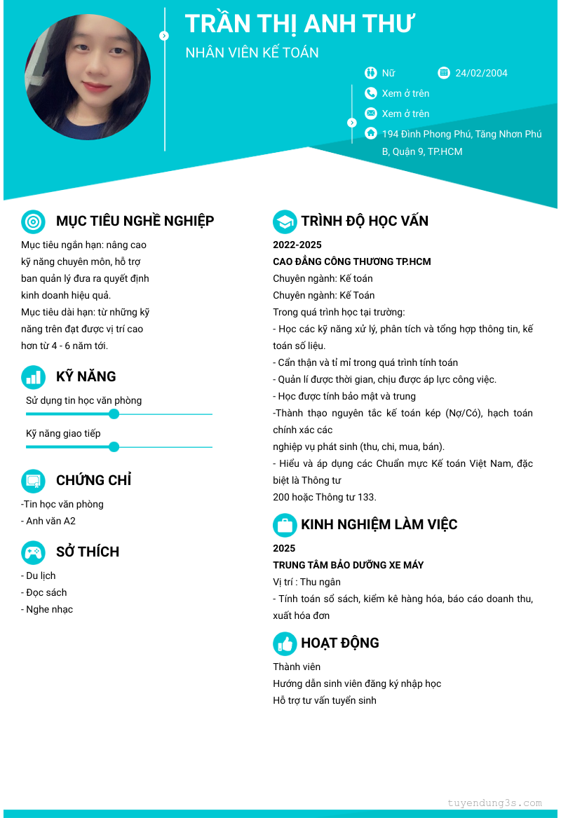 Mở xem thông tin đầy đủ ứng viên TRẦN THỊ ANH THƯ chỉ với 2 điểm. Ứng viên được cập nhật ngày 23/12/2025
